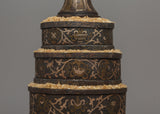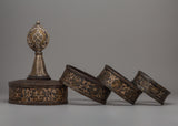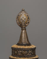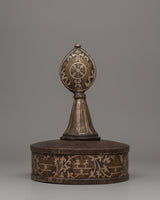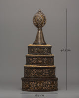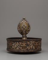 With this Tibetan Buddhist Mandala Offering Set, you can add elegance and dedication to your rituals while displaying magnificent workmanship and spiritual meaning. This offering set is handcrafted from iron and carefully embellished with 90% silver and brass inlays, with beautiful motifs inspired by traditional Tibetan creativity. Standing 40.5 cm tall, 18.5 cm wide, and weighing 2.12 kg, this mandala set is a significant and gorgeous addition to your holy area.
