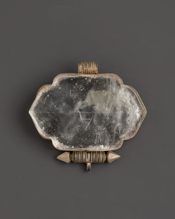 This Ghau box, which reflects the sacred creativity of Tibetan culture, is expertly crafted with a copper body and finished in silver plating. It has enduring Vajra designs and delicate filigree work. The Artificial stones enhance their attractiveness while suggesting healing and spiritual peace. This locket, typically worn or placed on altars, serves as a portable shrine and is ideal for storing mantras, relics, or other sacred items. Use this potent Himalayan item to enhance your altar, meditation area, or practice.