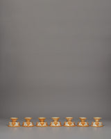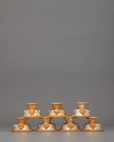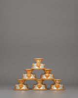 Copper is used to create these traditional sacred Tibetan offering bowls, exquisitely plated in silver and electro-gold. With a height of 5.5 cm, a base diameter of 5.5 cm, and an interior depth of 3.5 cm, each bowl is perfect for containing offerings like food, water, or incense during Buddhist ceremonies. The seven bowls in the set, each with accents of gold and silver, stand for devotion, purity, and connection between the material and spiritual worlds.