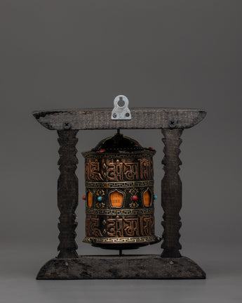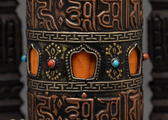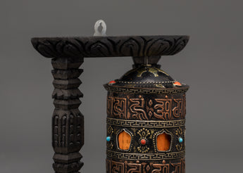 This Sacred Tibetan Spinning Mantra Wheel is a beautiful combination of spiritual symbolism and traditional workmanship. This wheel, crafted from copper, coral, and turquoise stones, is intricately carved from brass and wood, featuring complex designs of the vajra and ghau box. Standing 18.5 cm tall and 17 cm wide, the wheel is precisely designed to store ancient mantras, adding to its spiritual value. The incorporation of a wooden frame provides this ritual item a natural, earthy appearance that complements the Tibetan Buddhist iconography. Whether used for meditation or displayed as spiritual decor, it serves as a potent reminder of the Buddhist traditions' protection, wisdom, and enduring vitality.