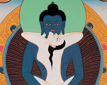 In the iconography of Tibetan Buddhism, Samantabhadra is typically shown with a blue body, symbolizing the expansive, sky-like nature of the mind, while Samantabhadri is depicted in white, representing purity and clarity. Their union signifies the non-dualistic state of enlightenment, where all dualities are transcended. The image of Samantabhadra and Samantabhadri in yab-yum is a profound representation used in advanced meditative practices, aiming to help practitioners realize the nature of their own mind as inherently pure and enlightened. This visualization practice is essential for cultivating a direct experience of the ultimate truth, beyond ordinary perception and conceptual thinking, guiding practitioners on the path to full enlightenment.