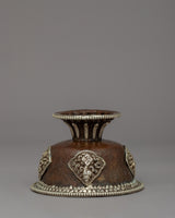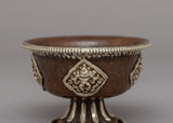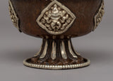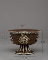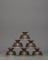 These artisanal offering bowls are ideal spiritual décor for your meditation area or Buddhist ceremonies and rituals. The oxidized copper body offers durability, and the silver-plated accents enhance its spiritual value. This set provides a significant and genuine Tibetan Buddhist tradition for your altar, encouraging you to strengthen your ritual practices or meditation focus. It is perfect for practitioners, monks, and spiritual seekers.