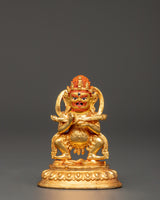 This wonderfully carved Shakya Mahakala statue is 9.5 cm tall and weighs 0.188 kilograms. Mahakala, known for its spiritual importance, is honored as a protector and guardian in Buddhist and Hindu cultures. This statue is precisely constructed with electro gold plating and an additional layer of pure gold powder on the face, which enhances its spiritual presence and aesthetic appeal. This Mahakala statue is ideal for meditation settings or as a one-of-a-kind cultural item. It represents strength, protection, and knowledge.