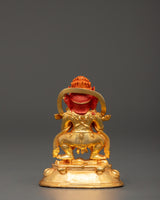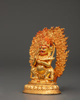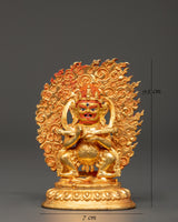 This statue, made of copper, exemplifies expert artisans' handiwork. The electro-gold plating adds a sumptuous touch while representing Mahakala's spiritual nature. The pure gold powder applied to the face strengthens the heavenly energy that Mahakala is thought to provide, making it an essential addition to any home or altar. Its small size and sturdy weight make it ideal for exhibition and meditation, as a continual reminder of safety and tranquility.