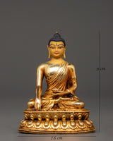 This Shakyamuni Buddha statue is 9 cm tall, with a 7.5 cm width and a weight of 0.23 kg. Crafted with a copper body and finished with stunning gold plating, the statue depicts the Buddha seated in the bhumisparsha mudra, a gesture symbolizing his calling to the Earth to witness his enlightenment. The double petal lotus seat beneath him signifies purity and spiritual enlightenment, providing a fitting foundation for this depiction of Shakyamuni Buddha. His long ears symbolize wisdom, and his calm face exudes tranquility, embodying the inner peace central to Buddhist teachings.