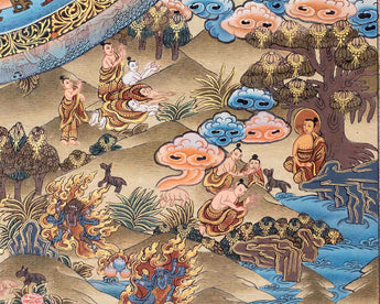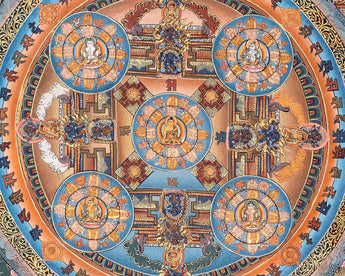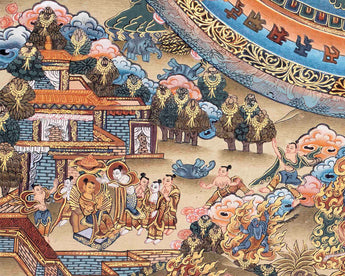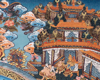 The Shakyamuni Buddha Mandala is a revered and detailed representation of Gautama Buddha, also known as Shakyamuni Buddha, and his life and teachings. This mandala is a spiritual tool for meditation and introspection and serves as a visual depiction of Buddhist cosmology.