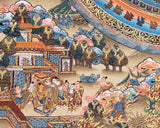 Shakyamuni Buddha is seated in the middle of the mandala, encircled by a brilliant aura that represents enlightenment. The composition of the mandala consists of numerous concentric circles and geometric patterns, embellished with exquisitely detailed images signifying significant occasions in the Buddha's life and teachings.