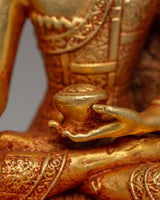 The Shakyamuni Buddha rulers of the Shakya clan statue is meticulously crafted from copper and finished in gold, highlighting its divine presence and intricate detailing. It measures 11 cm in height and 8.5 cm in width and depicts the Buddha in a meditative pose while seated on a beautifully designed lotus pedestal. His right hand is extended in the Bhumisparsha Mudra, symbolizing the moment of enlightenment, and his left hand is holding a traditional alms bowl, representing wisdom and compassion.