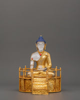 The artwork depicts Shakyamuni Buddha in a meditation posture with his hands in the Bhumisparsha Mudra, marking the time he invited the earth to witness his enlightenment. Above him, a dazzling covering of golden Bodhi tree leaves elegantly shelters the statue, representing wisdom, spiritual awakening, and security. The high platform surrounded by golden railings and exquisite step work enhances its temple-like elegance. At the same time, the smooth proportions of the face and body convey peaceful calm and divine grace.