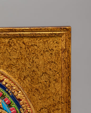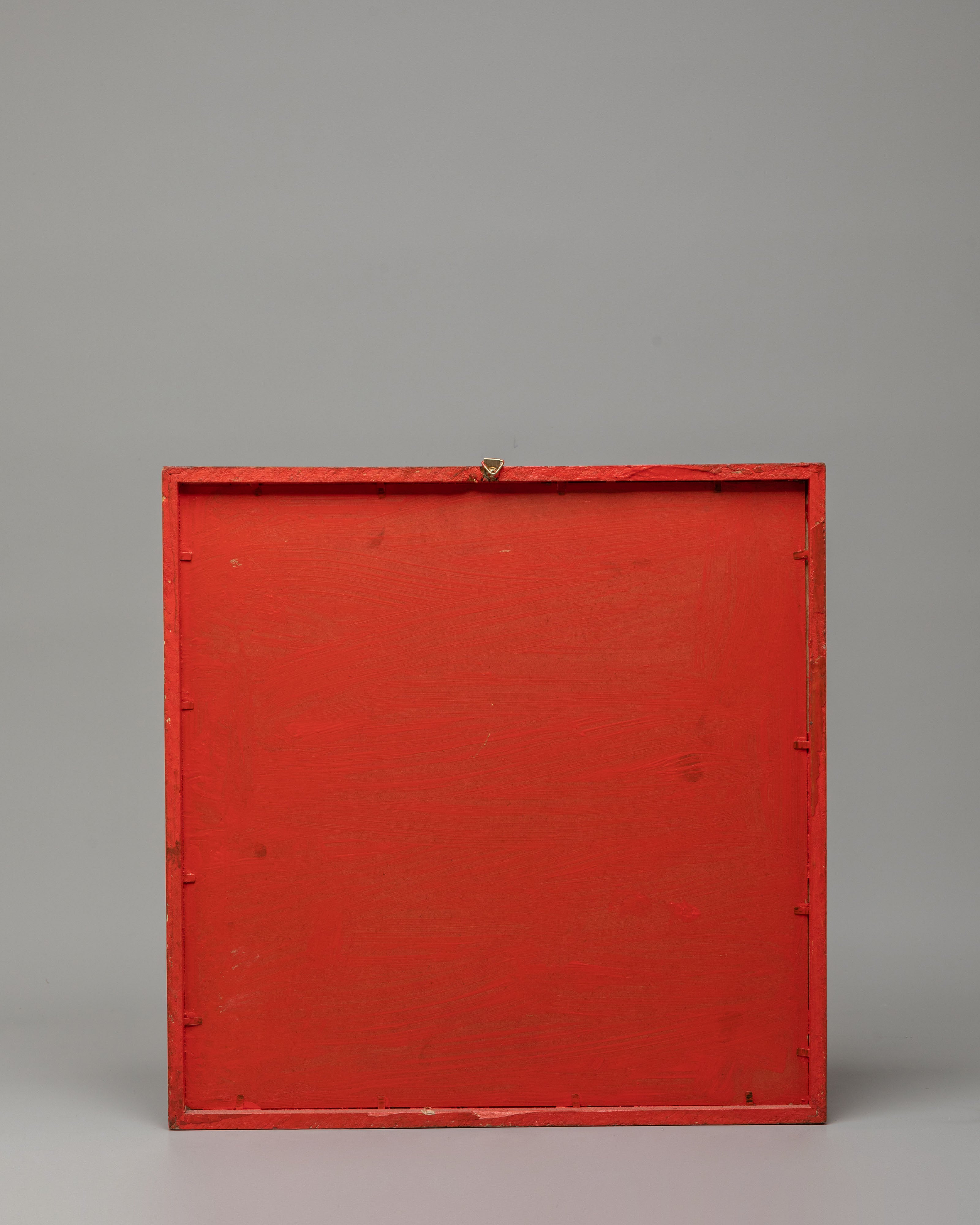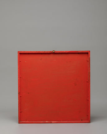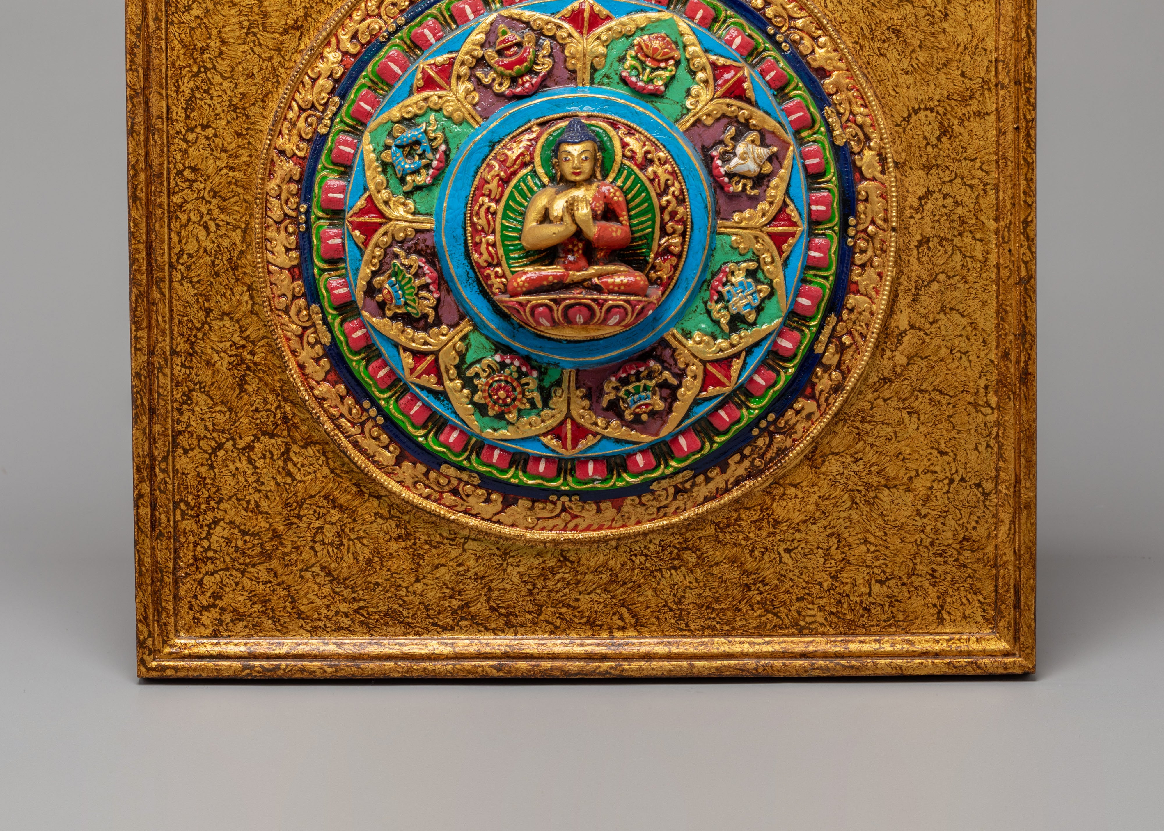 The design of the Shakyamuni Buddha Wall Art showcases the Buddha seated in lotus position, symbolizing inner peace and meditation. Surrounding him is a beautifully detailed mandala of interconnected petals and divine motifs, including flowers, animals, and symbolic figures that enhance the visual appeal while emphasizing the harmony and unity of the universe. The vibrant acrylic colors—including blues, reds, greens, and golds—bring a sense of balance, while the golden accents reflect the Buddha's enlightened nature. The wooden back of the piece adds to its traditional appeal, providing structural integrity and enhancing its spiritual symbolism.