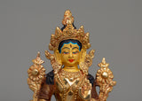 Shyama Tara, also known as Green Tara, is a beloved Buddhist deity of compassion, quick action, and protection. She responds promptly to prayers from those in need, guides followers to enlightenment, and removes impediments. This handcrafted statue, measuring 14.5cm tall and 11cm broad, is a stunning portrayal of her holy essence. It has a gold-plated finish over oxidized copper and beautiful acrylic color patterning.