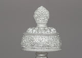 Our Silver Bhumba Ritual Vase, 20.5cm tall and 9cm wide, is precisely created from 27 Tola of pure silver (0.318kg). The Bhumba, an important symbol in Tibetan Buddhist rites, represents purity, plenty, and the flow of spiritual energy. It is used to store sacred offerings during cleansing ceremonies and blessings, making it an indispensable addition to any Buddhist altar or meditation room. The beautiful engravings and polished silver surface not only add elegance but also convey profound spiritual meaning.
