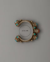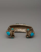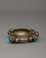 This Silver Body Bracelet is handcrafted from 97.5 silver and features finely placed turquoise and coral stones. Its dimensions are 2.5cm in height, 8.5cm in width, and 27.5cm in diameter, making it suitable for the majority of wrist sizes. The bracelet weighs 0.11kg, making it a lightweight but sturdy piece of Buddhist jewelry that may be worn throughout daily activities or meditation. The mix of silver and stones creates not only a beautiful appearance, but also improves spiritual activities.