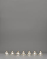 These butter lamp holders are impermeable to tarnishing because they are made of a powerful copper body and are elegantly silver-plated. They hold oil or butter firmly and are easy to arrange on an altar due to their minor appearance, measuring 4.5 cm in height and 6.5 cm in diameter. There is enough space for ceremonial offerings at the inner depth of 2.5 cm.