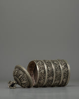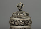 This intricately handcrafted rice pot box, made from a copper body with stunning silver plating, is both a functional and symbolic item in Buddhist culture. This rice pot enhances any space with elegance and historical significance, serving as both an essential and decorative object. Although every pot is meticulously made through hand, an exclusive and superior finish that exhibits the maker's commitment and expertise is secured.
