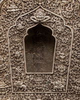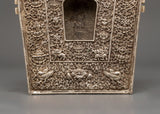 This stunning Silver Ghau Box, a traditional Tibetan portable shrine for retaining sacred relics, mantras, or protective amulets, respects tradition and spiritual protection. This Ghau box, measuring 23 cm tall and made of copper with a beautiful silver coating, is embellished with complex repoussé and chased designs, making it both a spiritual object and an exquisite example of a Himalayan work of art.