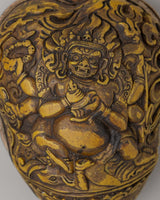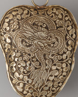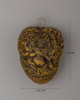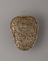 The Six-Armed Mahakala is represented in a wrathful form in the center of the locket, indicating his position as a strong guardian and obstacle remover. Each of his six arms reflects his ability to protect the six realms of existence, while his impassioned expression symbolizes the transformational force of wisdom and compassion. The Kapala-shaped locket, inspired by ritual skull cups, emphasizes the transience of life and the annihilation of harmful energies. The backside features a majestic dragon intricately decorated with flower motifs, representing strength, knowledge, and protection. This Tibetan Buddhist amulet is a very effective spiritual talisman for protection, meditation, and personal empowerment.