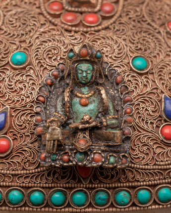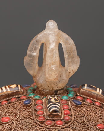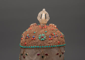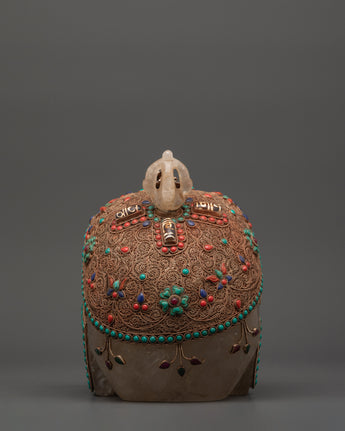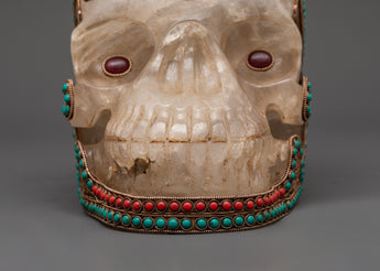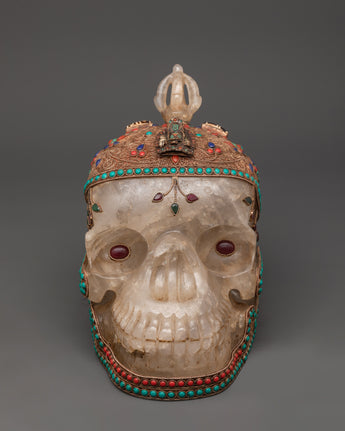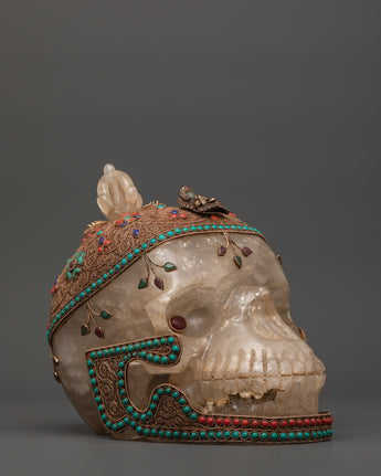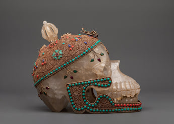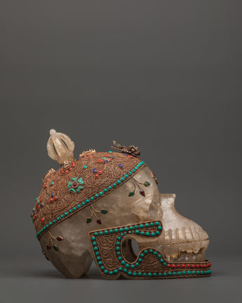 This Skull Head Crystal Decor is a unique gothic sculpture that expertly combines spiritual symbolism and powerful artistic expression. This imposing decorative piece is 23cm tall and 27cm wide, featuring a finely crafted skull embellished with beautiful copper details on the head and jaw, which lends it a distinct metallic appeal. The surface is further decorated with silver plating and tastefully inlaid with colorful coral and turquoise stones, which add to its visual appeal and energetic resonance. A half vajra, a revered Tibetan symbol of spiritual power, tenacity, and inner clarity, sits atop the skull, representing the path to enlightenment. A crystal is also included, which is thought to boost spiritual energy and induce profound healing vibrations.