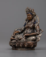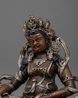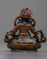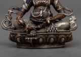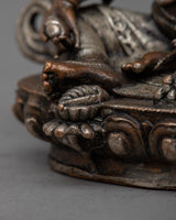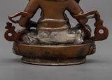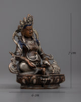 The little yet potent Dzambhala Statue is a depiction of the deity known in Tibetan Buddhism for being connected to wealth and prosperity. At a modest height of 7cm, this machine-made statue is precisely crafted, making it perfect for little sacred settings or personal altars. The statue's copper body, which is plated in a shiny silver finish, has fine detailing despite its diminutive size.