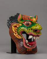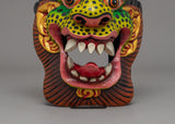 This Traditional Snow Lion Mask is a magnificent carved wooden decor piece with profound significance in Tibetan culture and mythology. Standing at 20 cm tall and 15 cm wide, it weighs 0.284 kg. Crafted from wood and hand-painted with acrylic colors, it showcases meticulous craftsmanship and exceptional artistry. The fierce appearance, brilliant colors, and sharp teeth symbolize the power and strength of the Snow Lion, a sacred creature in the Tibetan Buddhist tradition.