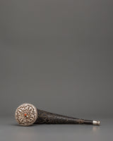 This Tibetan Snuff Horn is an example of traditional craftsmanship and creativity with spiritual significance. It is handcrafted from ethically sourced yak horn and features a finely carved pattern accented with pure silver and a brilliant coral inlay. Measuring 11 cm in height and 24 cm in breadth, the horn is a beautiful item and a valuable tool for spiritual rites. The coral, known for its healing properties, adds protection and vitality to the piece.
