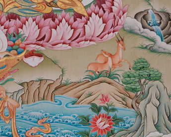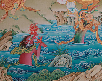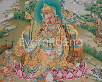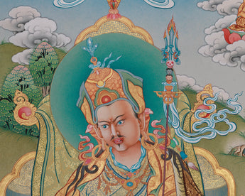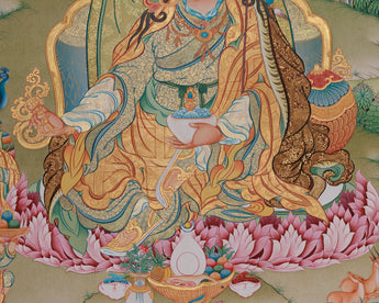 Guru Padmasambhava is depicted seated on a lotus throne, symbolizing purity and transcendence over worldly ties. He holds a vajra in his right hand, representing indestructible wisdom, and a skull cup in his left, symbolizing the transmutation of negative forces into enlightened awareness. Nagarjuna, the eminent Buddhist philosopher who founded the Madhyamaka school and elucidated the notion of śūnyatā (emptiness), is depicted above him on the top right. The inclusion of Nagarjuna emphasizes the continuity of knowledge in the Buddhist tradition. The backdrop features celestial beings and traditional Tibetan symbols, adding to the piece's overall spiritual significance.