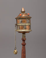 The elaborate design of this prayer wheel incorporates Buddhist teachings and spiritual symbolism. The whirling copper cylinder depicts the samsara cycle, while the hardwood handle represents the practitioner's connection to the soil. Spinning the wheel is thought to provide merit equivalent to reciting the mantra aloud, spreading compassion, and cultivating mindfulness. This Buddhist prayer wheel, ideal for personal use or as a thoughtful gift, is an uplifting addition to any spiritual practice, promoting inner calm and enlightenment.