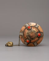 Crafted with care, this Buddhist Prayer Wheel is a precious object in Himalayan Buddhism that promotes attention and spiritual connection. It is 22.5cm in height and 5.5cm in breadth and weighs only 0.092kg, making it lightweight and portable. The wheel is made of reliable copper, has a wooden handle, and is embellished with coral stones, which represent vitality and spiritual force. Its outside is etched with the potent mantra "Om Mani Padme Hum," which heightens its religious importance and makes it an essential instrument for daily meditation and mantra recitation.