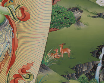 The Goddess Green Tara Canvas Print is a beautiful work of spiritual art meticulously created using Giclee printing on high-quality cotton canvas. This artwork captures the essence of Green Tara, a female Bodhisattva in Tibetan Buddhism known for her quick and compassionate responses to those who invoke her. The vibrant and efficient Giclee printing technique brings to life the goddess's rich colors and detailed features, making this canvas print a meaningful addition to any meditation space, home, or place of devotion.