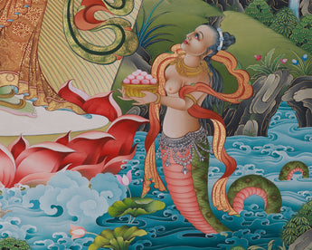 Goddess Green Tara stands gracefully on a lotus seat, symbolizing her purity and transcendence over the mundane world. The Amitabha Buddha's presence above her highlights her connection to universal compassion and infinite light. Naga Kanya, the serpent goddess, is shown below her, offering gifts, symbolizing the natural world's supportive and prosperous blessings. Green Tara's vibrant green color reflects her energetic and compassionate nature, ready to answer her devotees' prayers. Her posture and expression convey strength and serenity, reflecting her role as protector and guide.