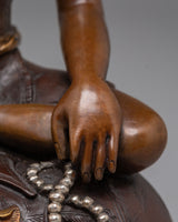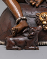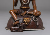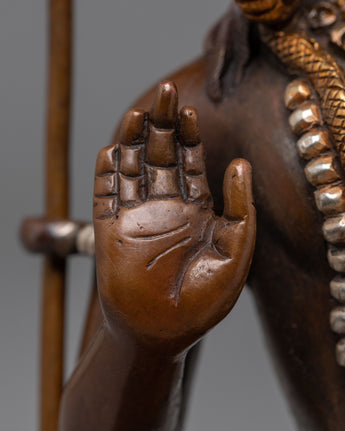 Every element of this Lord Shiva sculpture is rich in sacred symbolism. Shiva is depicted seated on a tiger or leopard skin, signifying his mastery over instincts and ego. In his right hand, he holds the Trishul (trident), representing the three forces of creation, preservation, and destruction. The third eye on his forehead symbolizes divine wisdom, the ability to perceive the unseen, and the kundalini energy represented by the sacred cobra (Naga) coiling around his body. The crescent moon adorning his matted hair symbolizes the cyclical nature of time and creation, while the Rudraksha beads across his torso further amplify the statue’s connection to Shiva worship and meditation practices. The oxidized copper finish enhances the rich texture, making the intricate relief work and serene facial expression truly stand out, radiating a sense of divine tranquility and spiritual presence.