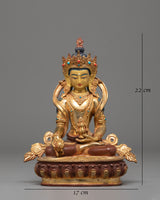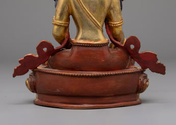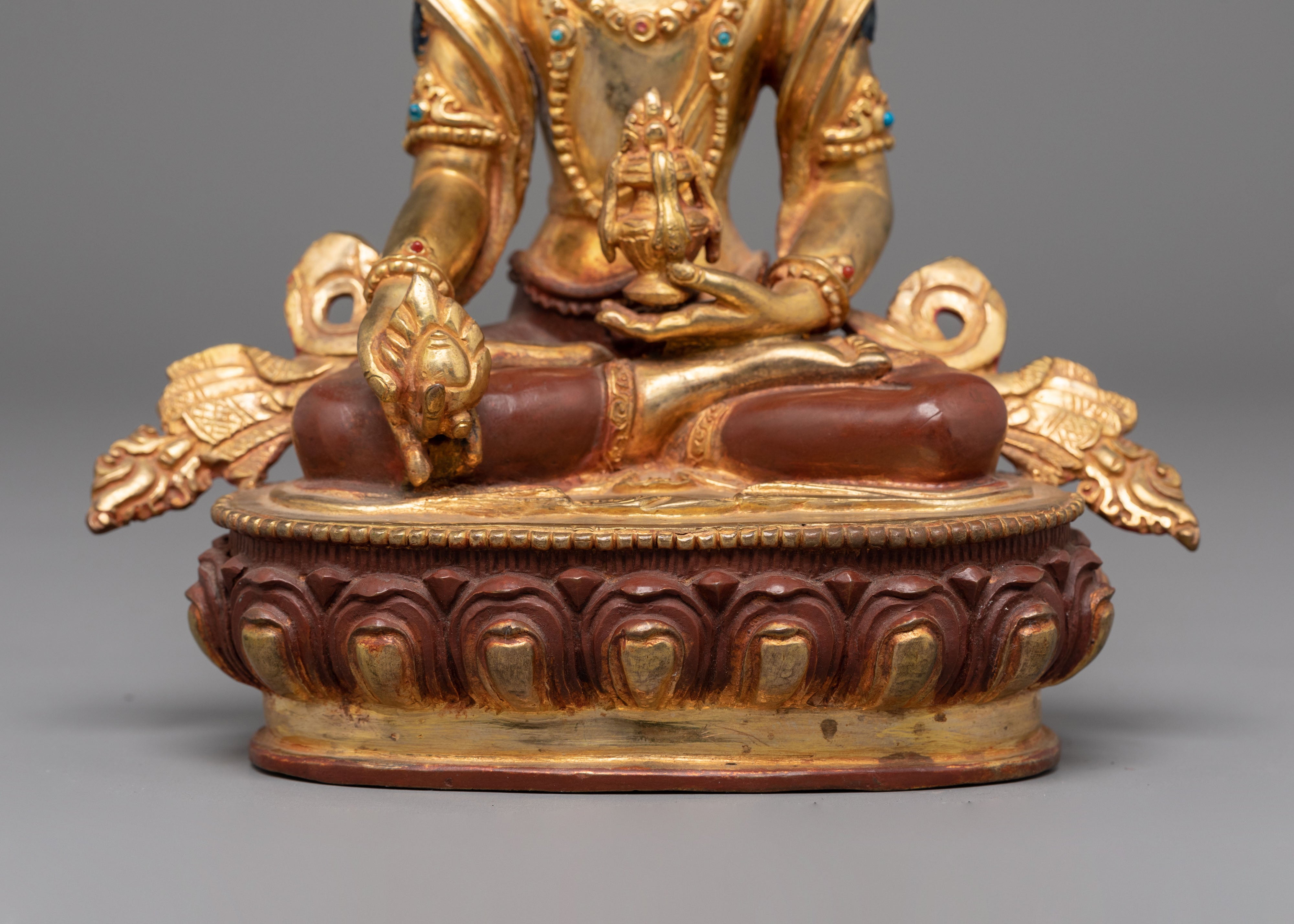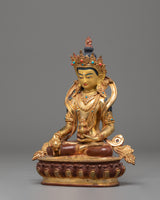 The statue depicts Kshitigarbha in a serene and protective posture, with one hand holding a staff that symbolizes his power to open the gates of hell and release souls trapped in suffering. His other hand has a wish-fulfilling jewel, symbolizing his vow to provide for the needs of all sentient beings. The rich gold plating and the turquoise and coral accents represent healing and protection, enhancing the statue's spiritual meaning. The colorful details draw attention to the sacred and compassionate nature of this revered bodhisattva, making this piece a powerful addition to your Buddhist altar or home.