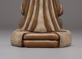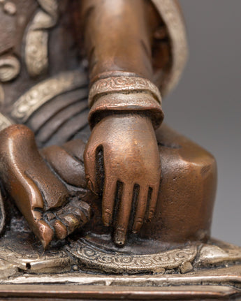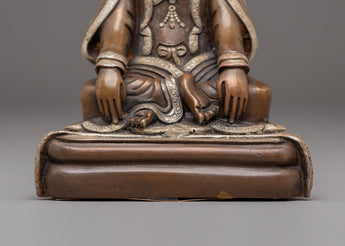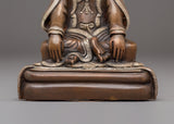 The statue’s oxidized copper body gives it a timeless, classic appearance, while the silver-plated details add an extra layer of refinement. Marpha is depicted in a sitting position, her hands resting peacefully, symbolizing her inner peace and profound teachings. The delicate, detailed robe design reflects the traditional Tibetan artistic style, showcasing the artist's exquisite craftsmanship. The serene facial expression, with her closed eyes, represents her deep focus on wisdom and enlightenment, making the statue a powerful reminder of the path toward spiritual liberation.