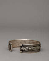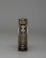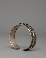 This wide Tibetan mantra bracelet is handcrafted from 92.5% Sterling Silver Om Mani Padme Hum Bracelet and written with the sacred chant "Om Mani Padme Hum." This significant cuff, measuring 2cm in height and 7cm in width, is intended to be both visually appealing and spiritually anchoring. The finely carved phrase is surrounded by floral designs and edged with delicate silver workmanship, making this piece a symbol of compassion, awareness, and spiritual strength.