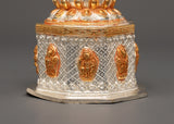 The Tibetan Stupa and Vajra Set is a beautifully crafted collection of ceremonial artifacts embodying the essence of Tibetan mysticism. The Stupa, standing 29 cm tall and 16 cm wide, beautifully symbolizes peace, enlightenment, and the teachings of the Buddha. The Vajra stand, a complementary piece in this set, measures 12.5 cm and serves as a powerful emblem of knowledge and indestructible truth, aligning with the teachings of Vajrayana Buddhism. Together, they make a strong statement in any Tibetan spiritual practice or meditation space. Both pieces, made of copper and coated with electro-gold and silver, showcase intricate details and exceptional craftsmanship.