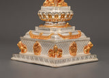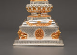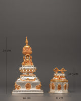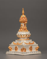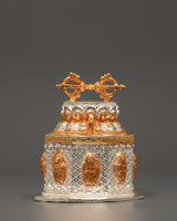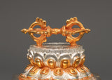 The Stupa features golden accents around its base and a characteristic dome, representing the universe and spiritual elevation. The Vajra stand, beautifully crafted with gold and silver plating, symbolizes the holy energy that pierces through ignorance and delusion, which is essential to Tibetan Buddhist rites. This breathtaking Stupa and Vajra Set is not only a stunning spiritual treasure but also a powerful symbol used in ceremonies to promote peace, blessings, and knowledge. The Stupa is often said to represent Buddha's enlightened mind, while the Vajra stand is a sacred ceremonial item believed to have the ability to inspire spiritual enlightenment. These sacred artifacts are perfect for those looking to enhance their practice or display strong Tibetan Buddhist symbolism.