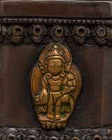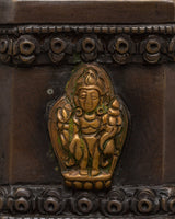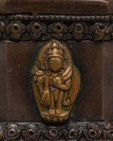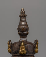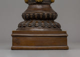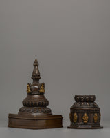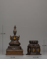 The Stupa with Dharma Dhatu Statue is a stunning handcrafted combination meticulously constructed to symbolize major parts of Buddhist spiritual heritage. This set is made of oxidized copper and plated with gold, giving the pieces a timeless and religious aspect. The stupa stands 22 cm tall and 13 cm wide, weighing 2.02 kg, and the more miniature Dharma Dhatu stupa is 11 cm tall and 11.5 cm wide, weighing 1.13 kilograms. The two components combine to form a unified picture of Buddhist teachings and symbolism.