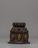 This set is intricately crafted and steeped in heritage. The stupa has a gold-plated finish with exquisite carvings that highlight the holy images of Buddha figures, representing the way to enlightenment. The Dharma Dhatu stupa, with its elaborate design, complements the main stupa by expressing the interdependence of all things throughout the universe, as taught in Buddhism. The contrast of copper and gold plating creates a dramatic visual appeal while conveying a sense of spiritual importance.