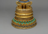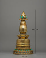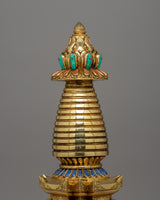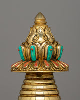 This magnificent Copper Body Stupa with floral carvings stands 44.5 cm tall and 22 cm wide, showcasing exceptional craftsmanship and deep spiritual meaning. Its 24K gold-gilded finish shines brilliantly, reflecting light from all angles and enhancing its divine presence. The stupa is adorned with Lapis Lazuli and Turquoise stones, which add to its beauty and contribute to its sacred energy. These stones are strategically placed around the base and spire, symbolizing wisdom and spiritual enlightenment. At the top, a parasol with a jewel pinnacle completes the design, representing protection and spiritual guidance.