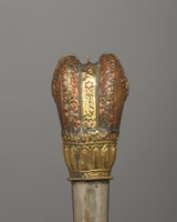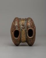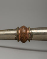 This Tantric Trumpet Kangling is a finely crafted Tibetan Buddhist ritual instrument used for Chöd meditation and Tantric ceremonies. This sacred trumpet, made of a copper body with delicate brass alloy decoration, spans 43cm in width and 9.5cm in height and weighs 0.364kg when balanced. The Kangling, traditionally used in esoteric ceremonies, is an essential spiritual tool for those practicing advanced Vajrayana meditation and Buddhist sound offerings. This authentic Tibetan ritual horn, with superb workmanship and elaborate ornamentation, is an excellent addition to any Buddhist shrine, monastery, or meditation place.