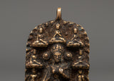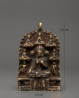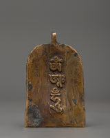 Crafted from antique-finished brass, this piece showcases delicate handwork. It shows Tara seated in a meditative pose surrounded by symbolic characters. The aged patina adds to its historic charm, enhancing its genuine spiritual essence. Its modest size (8.5 cm × 5.5 cm) allows for easy placement, while the robust brass material promises longevity for generations. Whether for personal devotion or as a thoughtful gift, this handcrafted wall hanging is an everlasting symbol of Buddhist wisdom.