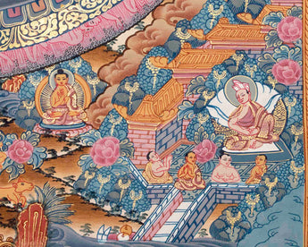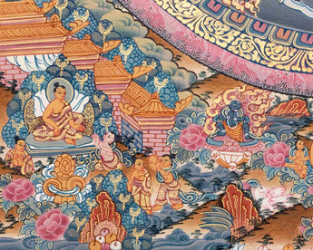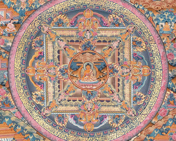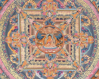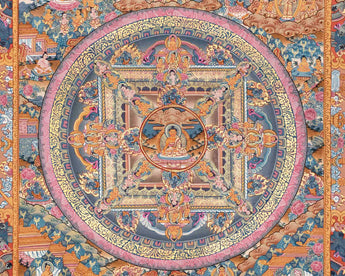 Presenting the mesmerizing Buddha Mandala Thangka, a beautiful depiction of heavenly presence and spiritual harmony. The primary Buddha figure is flanked by a wide variety of other deities in this stunning work of art, weaving a cosmic tapestry of spiritual energy. Each deity is meticulously painted by hand and exudes a distinct aura and symbolism that represents numerous dimensions of enlightenment and spiritual instruction. You are taken to a place of transcendence and inner serenity as your eyes follow the delicate brushstrokes and vivid hues. The mandala that surrounds the gods acts as a sacred entrance, representing the connection between all things and the journey to enlightenment. The Buddha Mandala Thangka becomes a powerful source of inspiration, beckoning you whether it is kept in your home as a treasured piece of art or displayed as a sacred focal point.