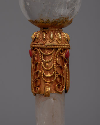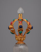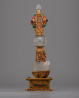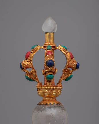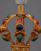 An essential part of Tibetan Buddhist ceremonies, the vajra knife represents severing ignorance and eliminating evil energies. Its spiritual resonance is increased by the addition of several valuable stones, including ruby for passion, lapis lazuli for insight, coral for vitality, turquoise for protection, and crystal for clarity. The knife's exquisite features and sparkling beauty are highlighted by the electro-gold plating, which gives a bright finish, and the accompanying stand, which offers a solid and elegant foundation.