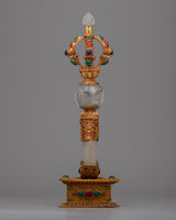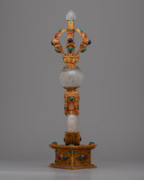 Presenting the Tibet Vajra Knife with Stand, a fantastic example of meticulous craftsmanship and spiritual artistry. This gorgeous knife, handcrafted with a copper body and tastefully electroplated in gold, is set with crystal, ruby, lapis lazuli, turquoise, and coral. At 33 cm in height and 10.5 cm in breadth and weighing 0.536 kg, it is an aesthetically stunning and profoundly significant monument.