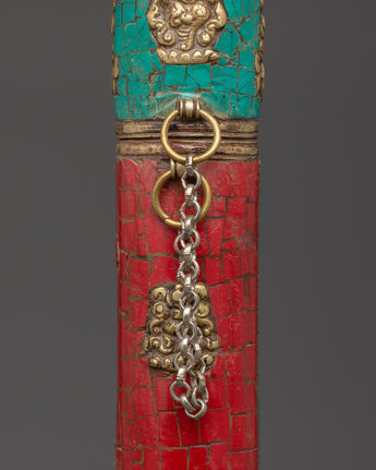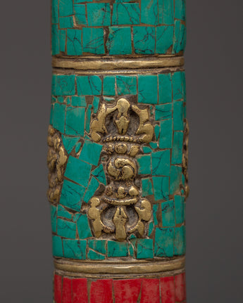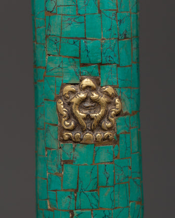 Embrace the spiritual essence of Tibetan workmanship with this handcrafted Tibetan Brass Incense Holder, which has turquoise and coral inlays. This exquisite item, made of brass with artificial stone features, stands 27 cm tall and 3.5 cm wide. It symbolizes the Himalayan region's rich creative traditions and is ideal for meditation settings, religious rituals, or as an individual decorative piece.