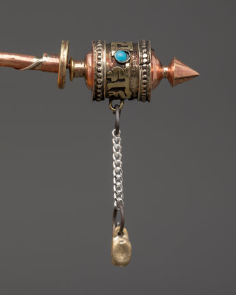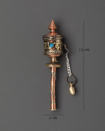 This Tibetan Brass Prayer Wheel, measuring 7.5 cm in height and 2 cm in breadth, weighing about 0.010 kg, is made of a copper or brass body decorated with artificial turquoise stones. These prayer wheels are spiritual tools used in Tibetan Buddhism to acquire wisdom and merit, as well as to purify negativities by spinning the wheel, which is frequently inscribed with the mantra "Om Mani Padme Hum" and filled with mantras inside.