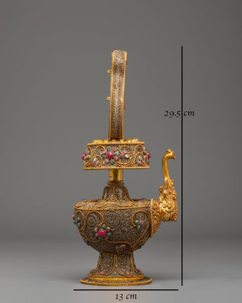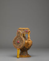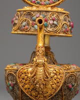 This Tibetan Buddhist Bhumba for Ritual is a beautifully crafted ceremonial vessel used in Buddhist rituals to carry offerings, represent purity, and invoke blessings. Standing at 29.5 cm in height and 13 cm in width, this sacred Bhumba is plated in copper, gold, and silver, making it a striking piece of spiritual art. The gold and silver plating symbolize divine purity, while the artificial coral and turquoise stones add color and spiritual significance, invoking protection and vitality during rituals. This Bhumba is an essential item in Tibetan Buddhist ceremonies and practices, symbolizing the vessel for sacred offerings and spiritual transformation.