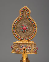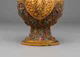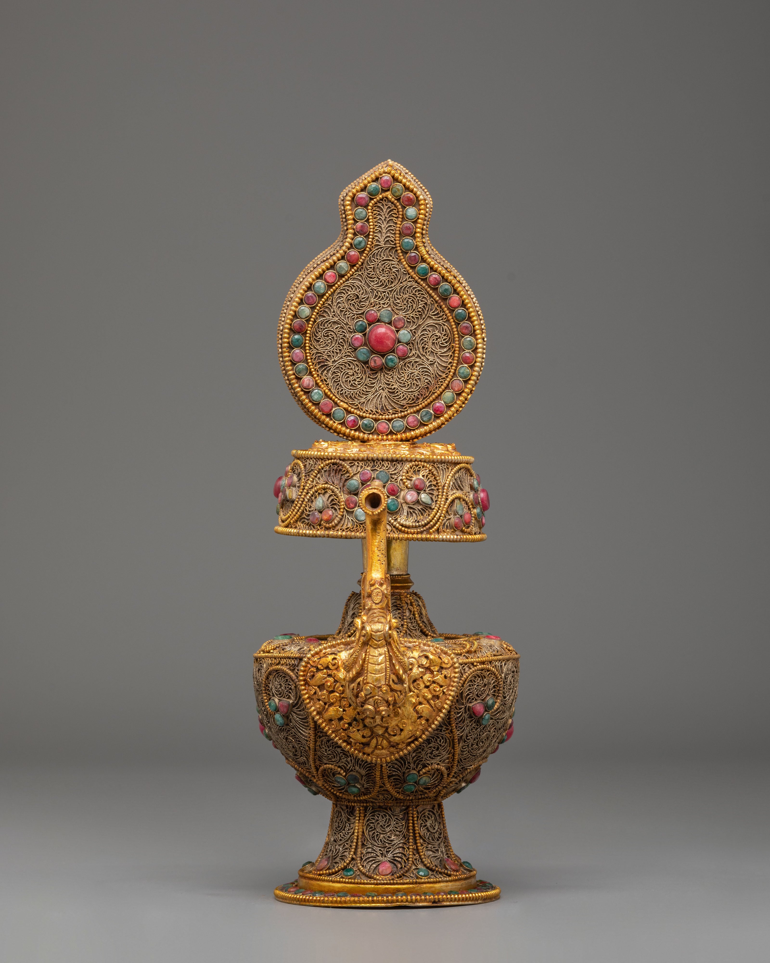 The Bhumba's design features intricate copper craftsmanship, with gold-plated accents that highlight the vessel’s importance in spiritual rituals. The decorative motifs include lotus flowers and flame-like designs that symbolize enlightenment, purification, and the continuity of life. The coral and turquoise stones are placed strategically, with coral symbolizing strength and turquoise representing wisdom and protection. These vibrant stones enhance the Bhumba's spiritual potency, making it a significant object in any Buddhist altar or meditation space.
