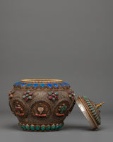 Sacred Tibetan Buddhist Dhupur Rice Pot | Gemstone Inlaid Buddhist Altar Decor