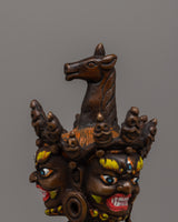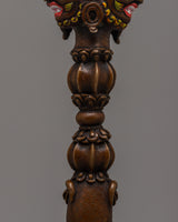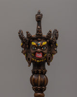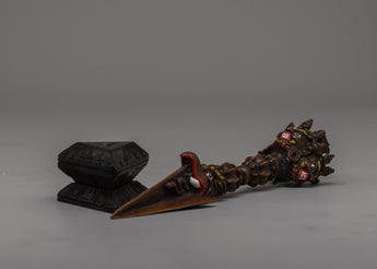 With the help of our Tibetan Buddhist Dorje Phurpa Vajra Dagger, set off on a path of spiritual protection and wisdom. This sacred dagger is handcrafted from oxidized copper, a symbol of strength and tenacity, with great attention to detail. Reaching a towering 30 centimeters, it radiates strength and mystery and is a powerful instrument for spiritual seekers.